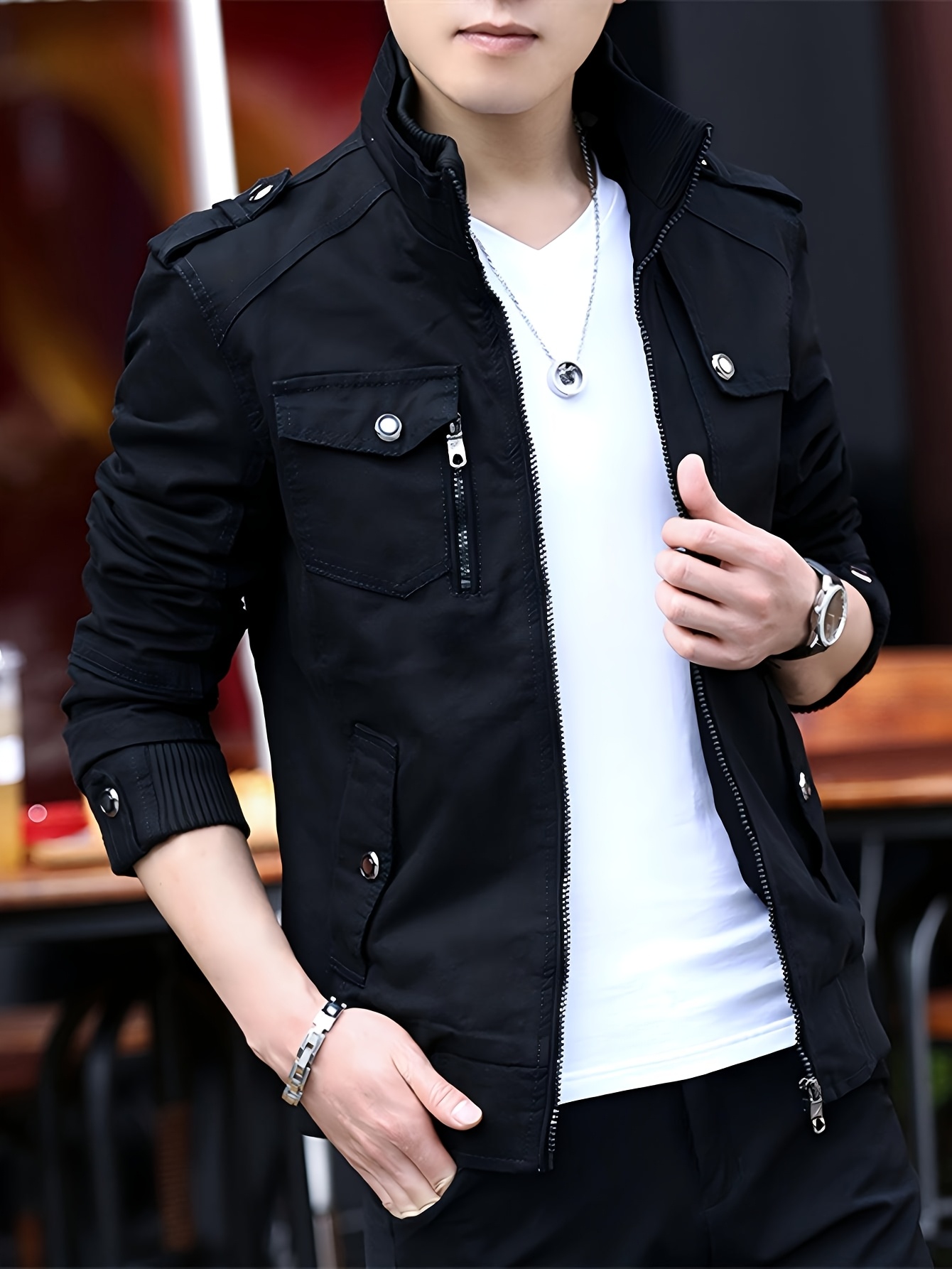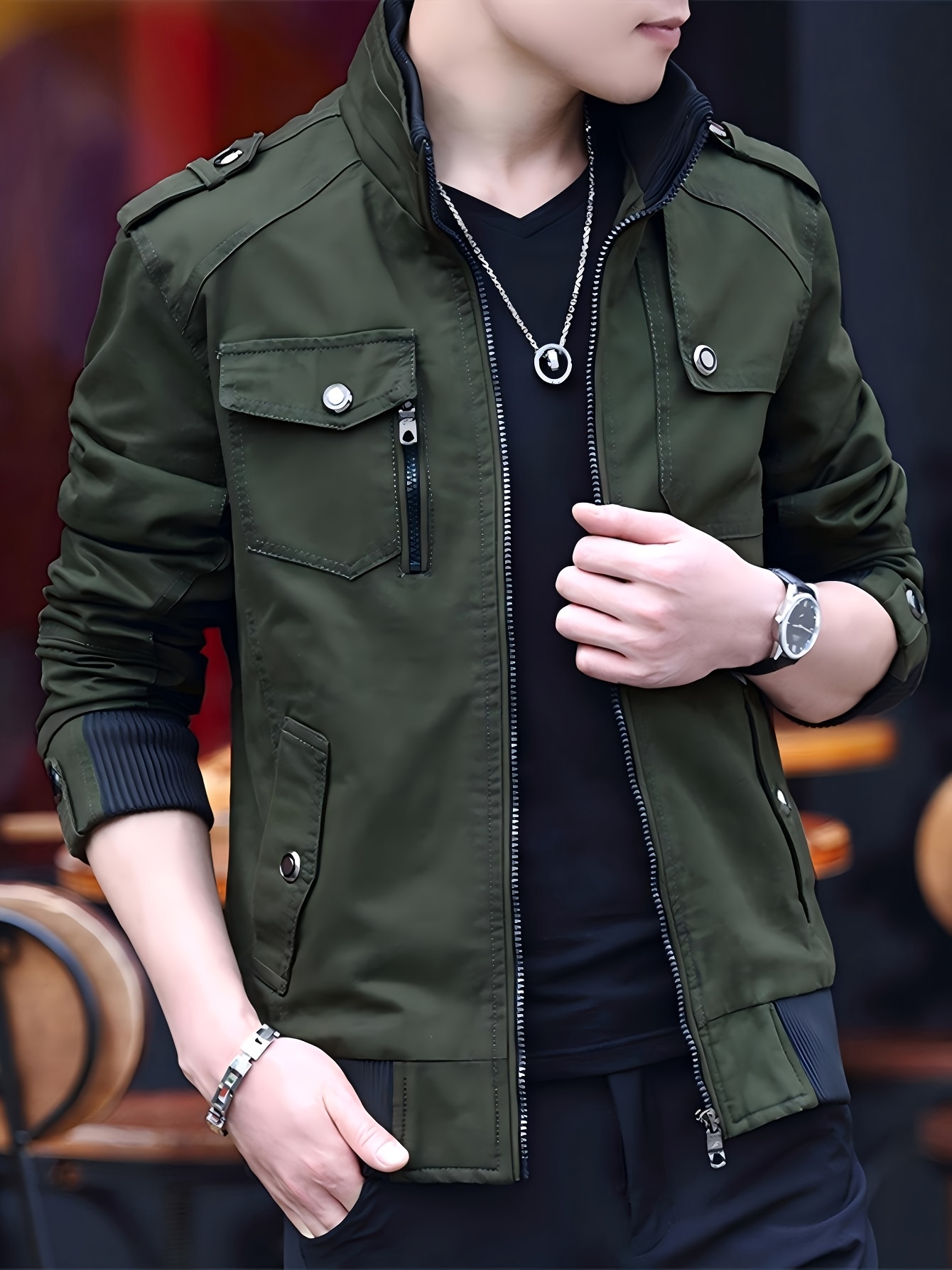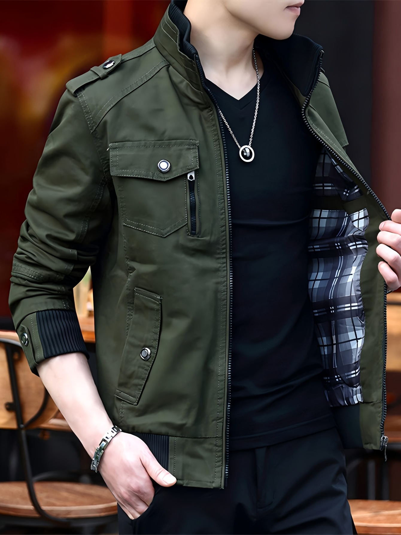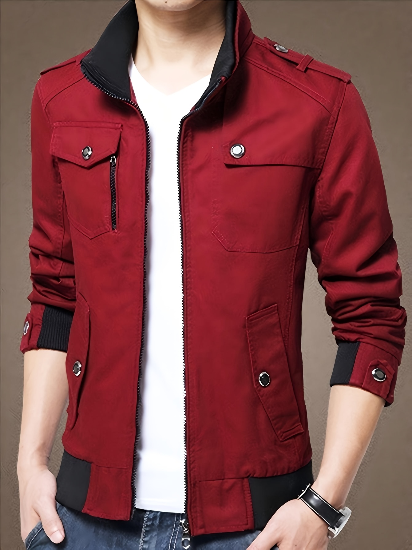 Chaqueta Bomber de Trabajo para Hombre, con Cuello Alto, Múltiples Bolsillos, Estilo Maroon, Cierre con Cremallera, Mangas Largas, Abrigo Casual para Otoño/Invierno, Chaqueta Bomber para Invierno