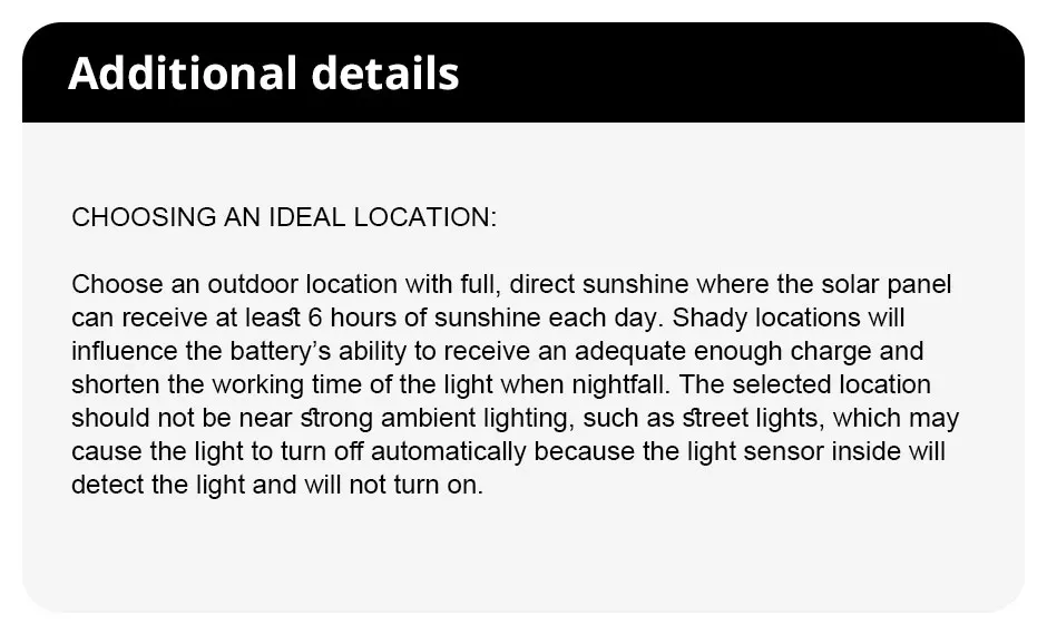 Si hay un botón en la caja de batería para el artículo, presiónelo a la posición "ON". Esto activará la luz que le permitirá encender y cargar. Cuando el ambiente se vuelve oscuro, la luz solar se encenderá automáticamente. Durante el día, la luz solar se apagará y recogerá energía del panel solar automáticamente. Si presiona el botón nuevamente, la luz se apagará y dejará de cargarse y descargarse para preservar la batería. Si la luz no puede encenderse automáticamente por la noche después de 24 horas de carga durante el día, compruebe lo siguiente: