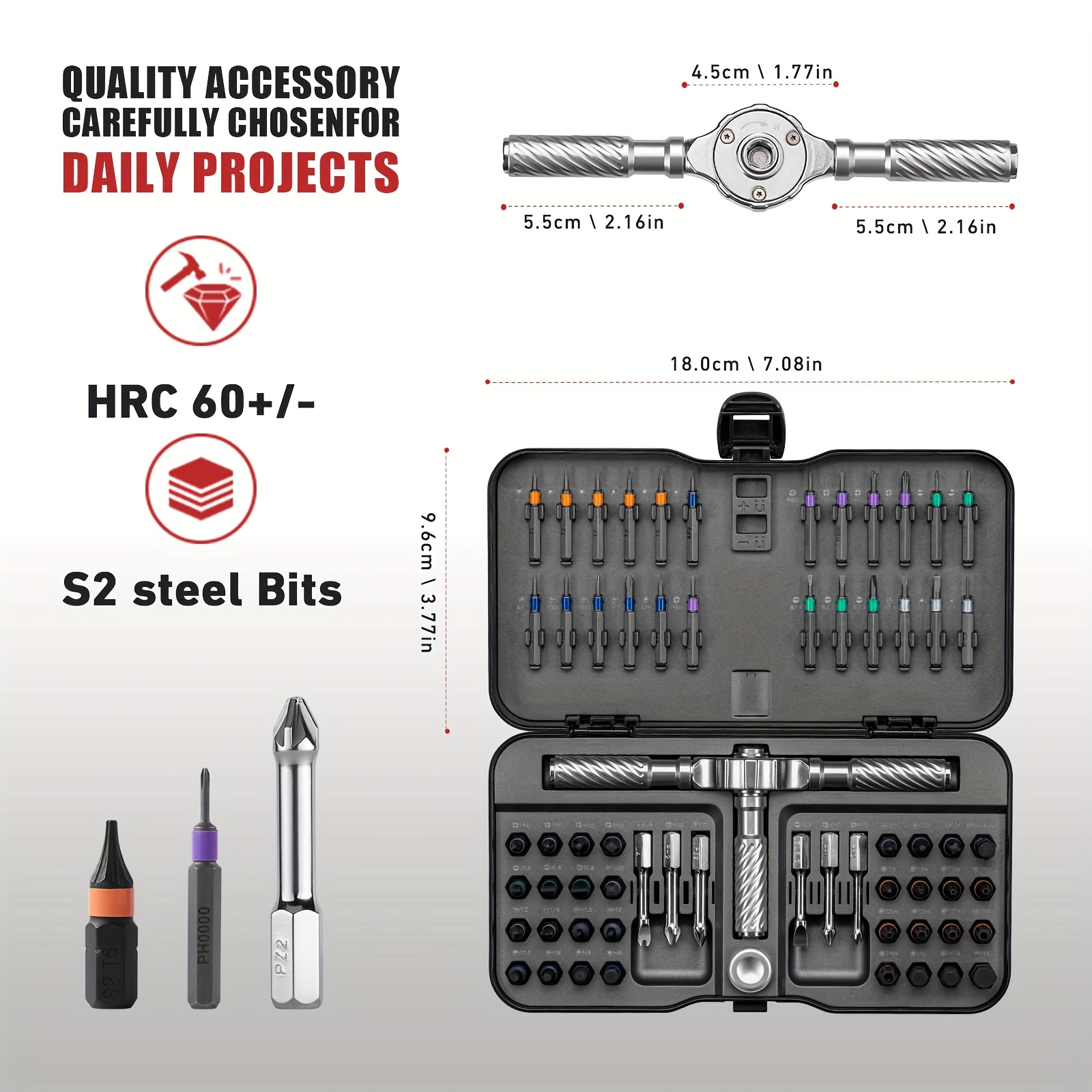 Este kit de destornilladores multi-bit incluye 62 bits fabricados con acero aleado de cromo-molibdeno magnético S2, con 38 bits de 6,35 mm (1/4 pulgada) y 24 bits de 3,97 mm (5/32 pulgada). Es ideal para tareas de mejora del hogar y electrónica de precisión. Los bits se someten a un proceso de tratamiento térmico continuo, lo que proporciona una gran dureza sin fragilidad y una resistencia excepcional. Este conjunto está diseñado para cumplir con los requisitos profesionales en diversas situaciones, incluyendo el uso en el hogar, el trabajo, los proyectos de bricolaje y las reparaciones.