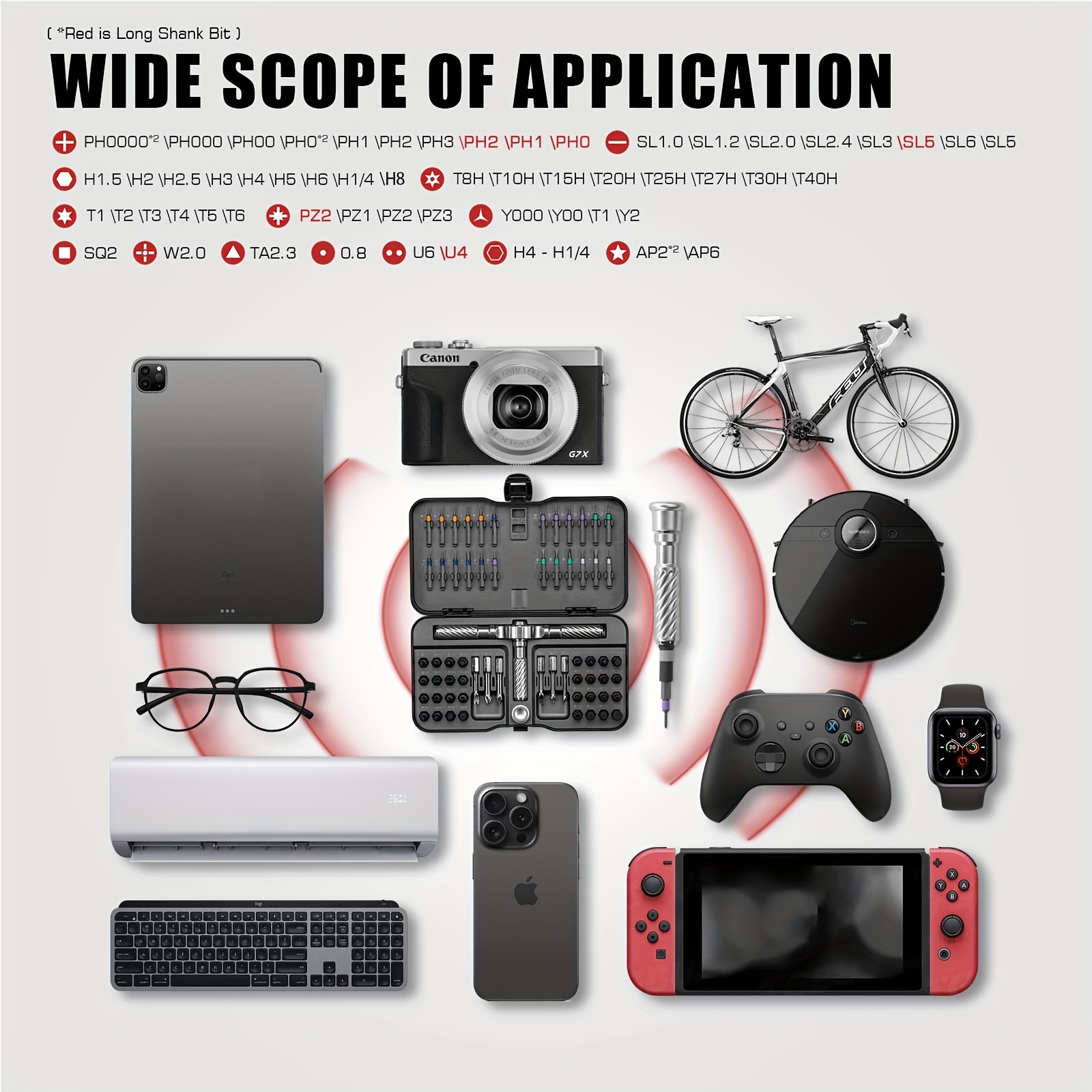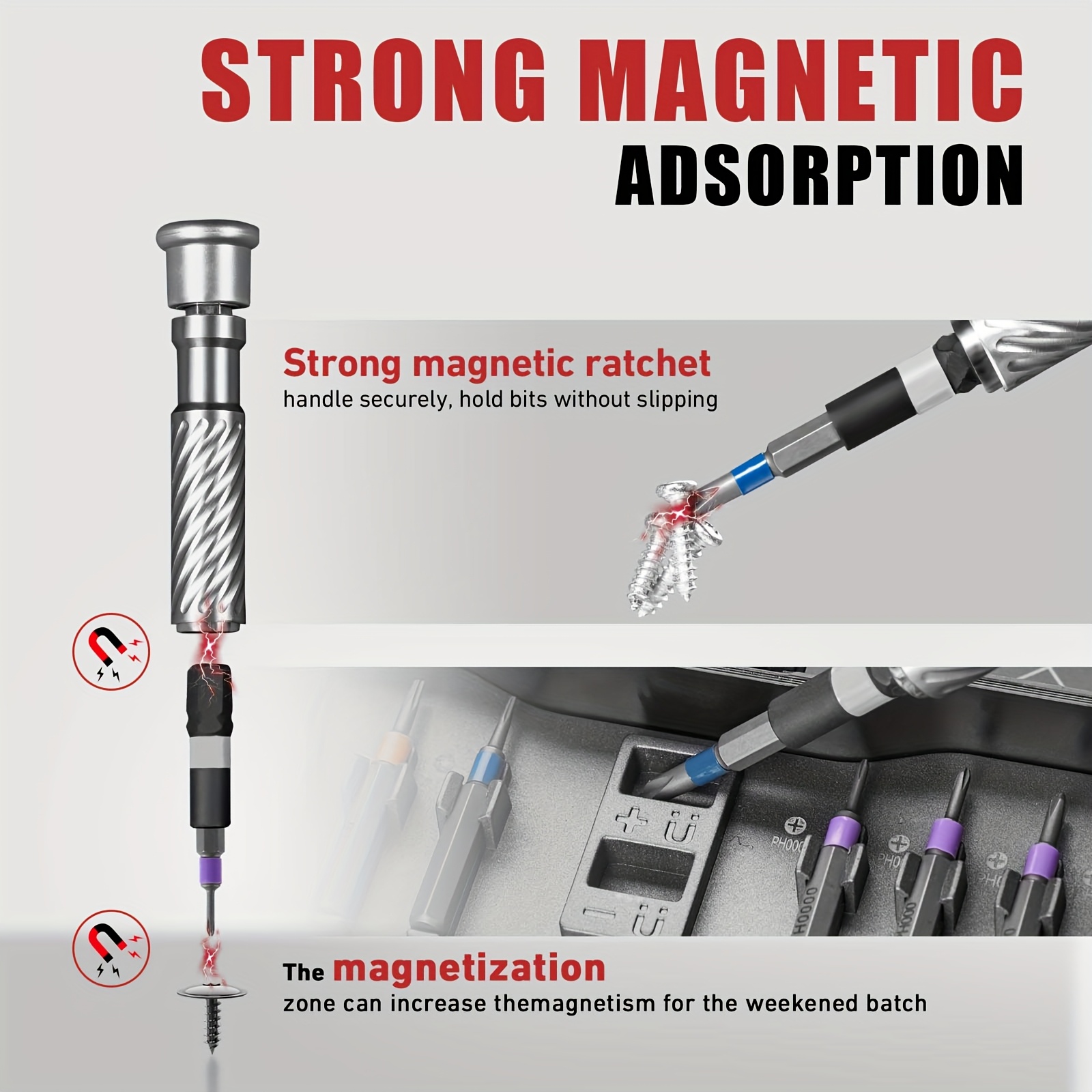 Es capaz de gestionar de manera efectiva múltiples tareas, como reparar electrodomésticos importantes, operar herramientas eléctricas, mantener vehículos y trabajar con dispositivos de precisión como teléfonos inteligentes, computadoras, cámaras y relojes. Además, el mango cuenta con un potente imán que mantiene firmemente el troquel de destornillador hexagonal, y la cámara de magnetización integrada puede restaurar la magnetización del troquel de destornillador siempre que sea necesario, lo que lo hace fácil de usar y portátil.