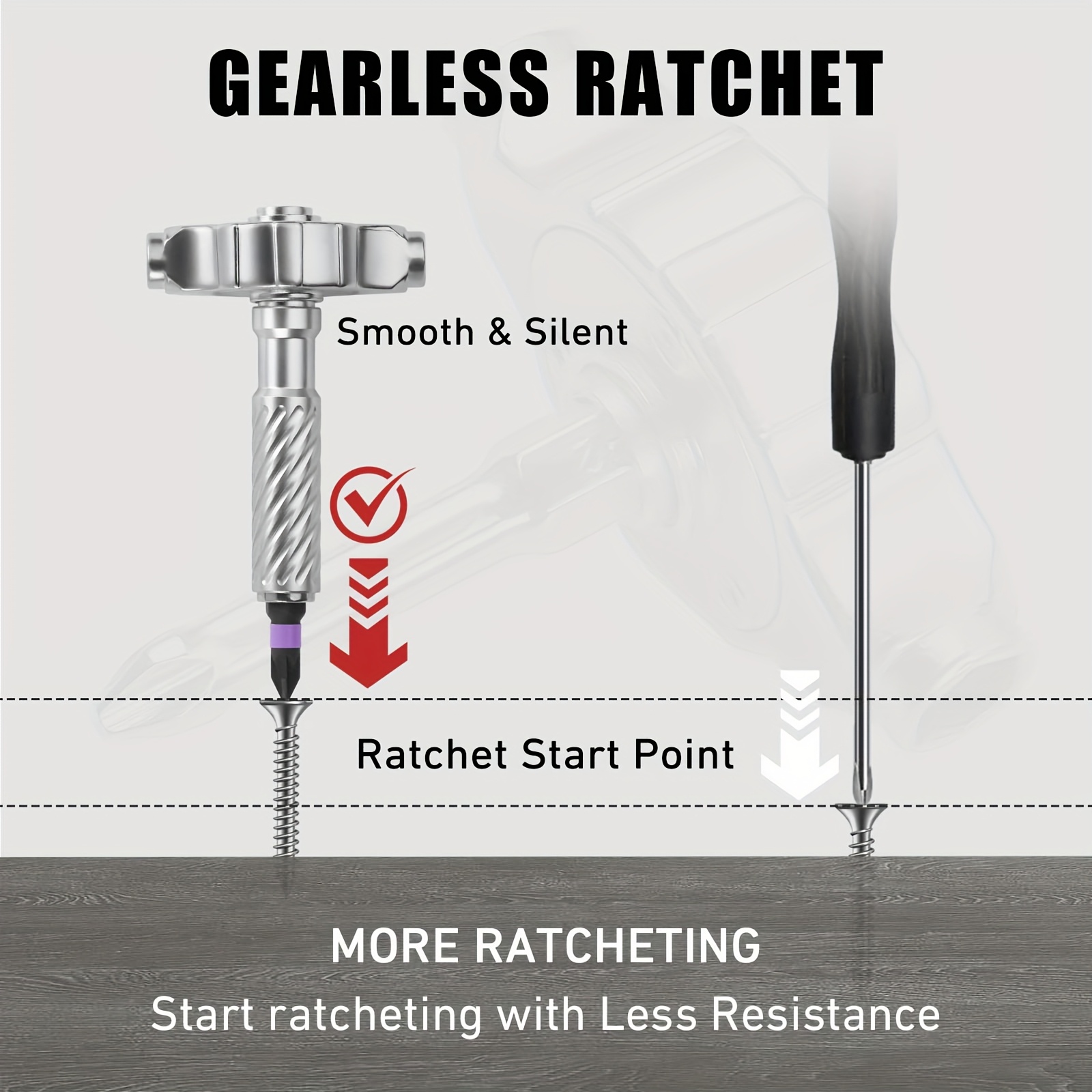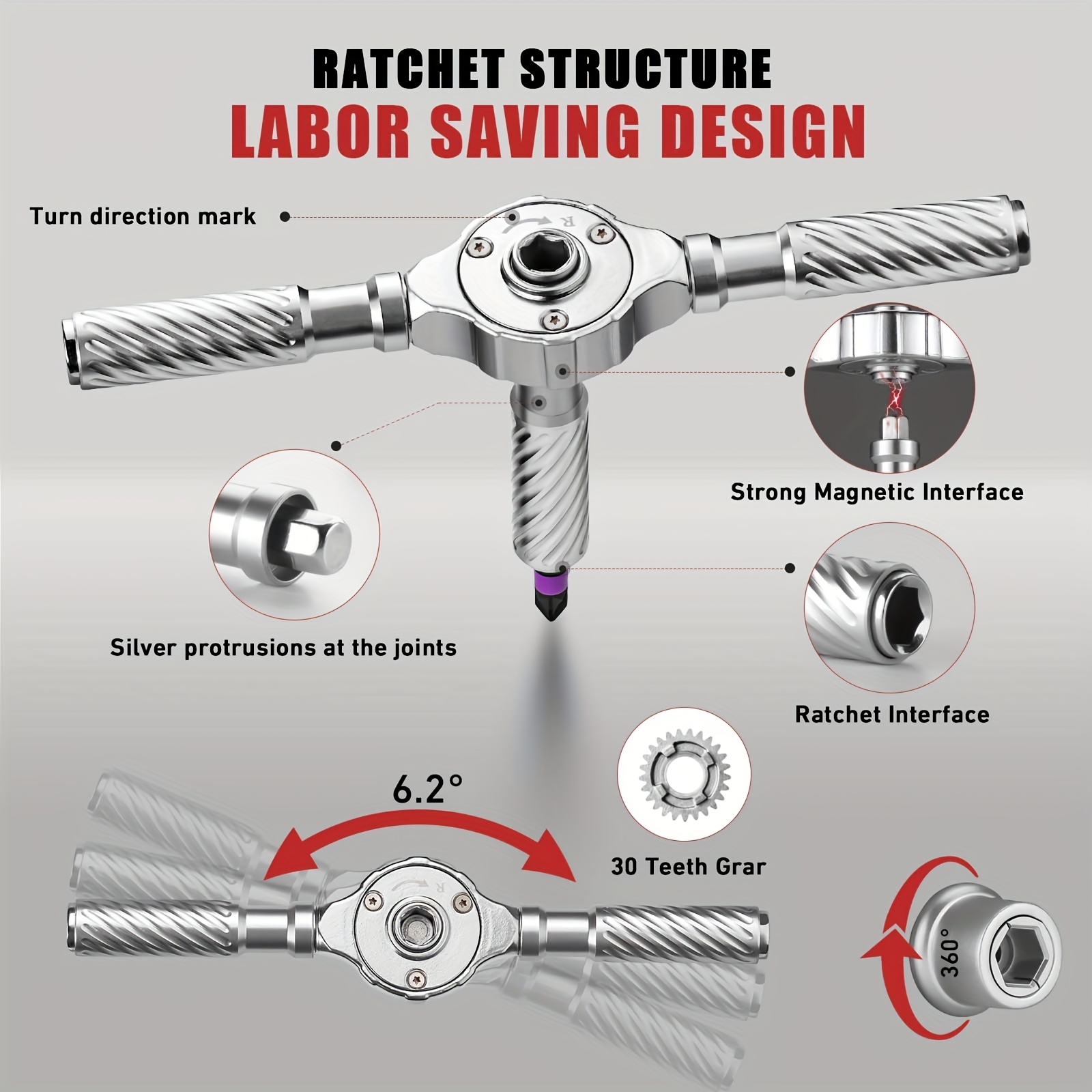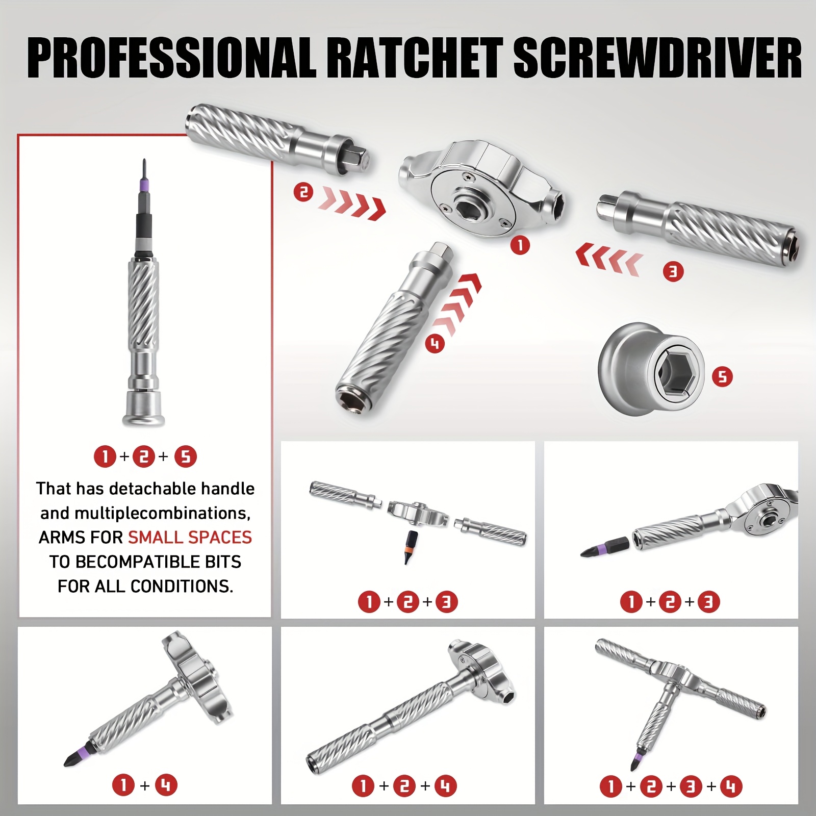 Este destornillador multi-bit con mango de aleación de aluminio cuenta con un diseño de ratchet que reduce significativamente el esfuerzo, permitiendo un 80% menos de esfuerzo. Permite un manejo fácil de diferentes dispositivos o herramientas domésticos para reparaciones, ajuste o suelta de tornillos, lo que conserva tiempo y energía sin necesidad de repositionar el brazo.