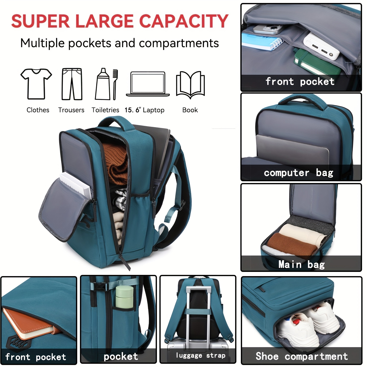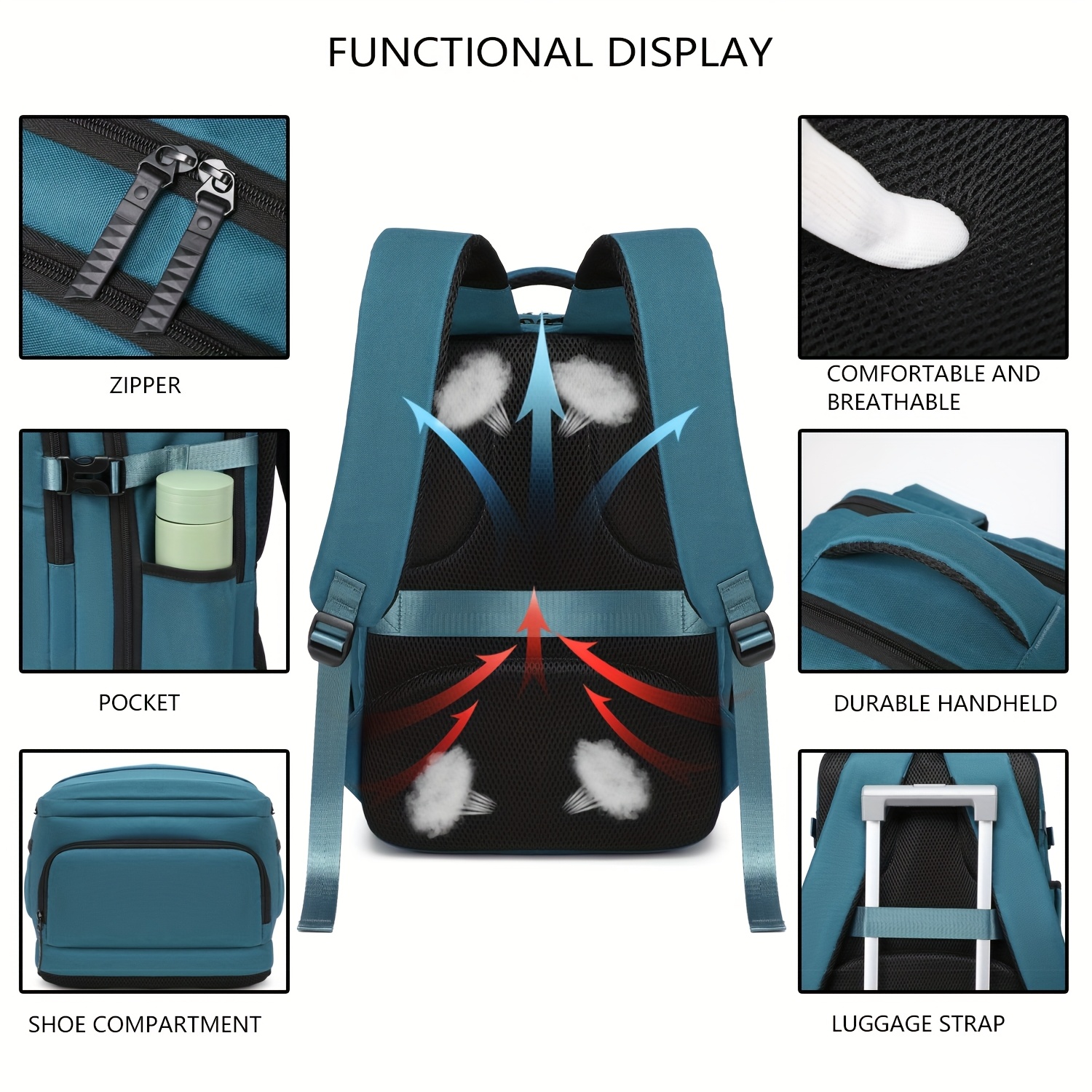 Funciones especiales: Mango de carrito, Compartimento para computadora portátil, Compartimento para calzado