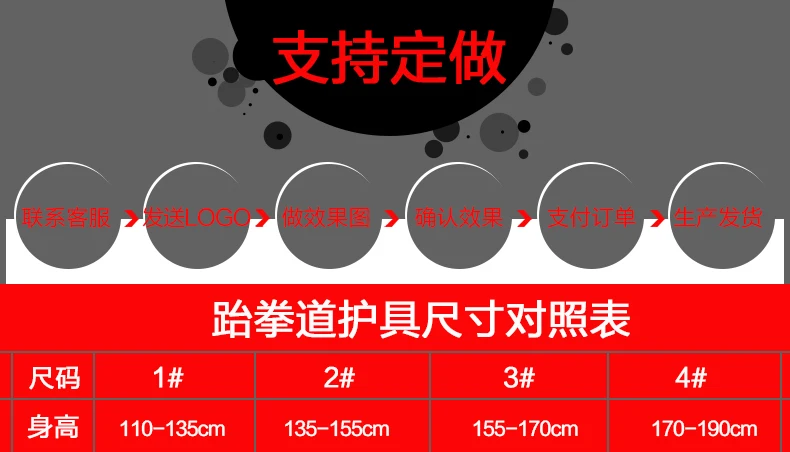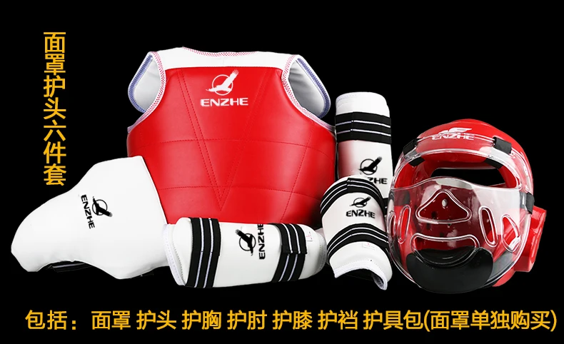 Paquete:1 protector de pecho; 1 par de protectores de brazo; espinilleras 1 par de; 1 casco; 1 protector de ingle; 1 par de guantes de Taekwondo; 1 par de calzado; 1 piezaBolsa(Total de 8 piezas)