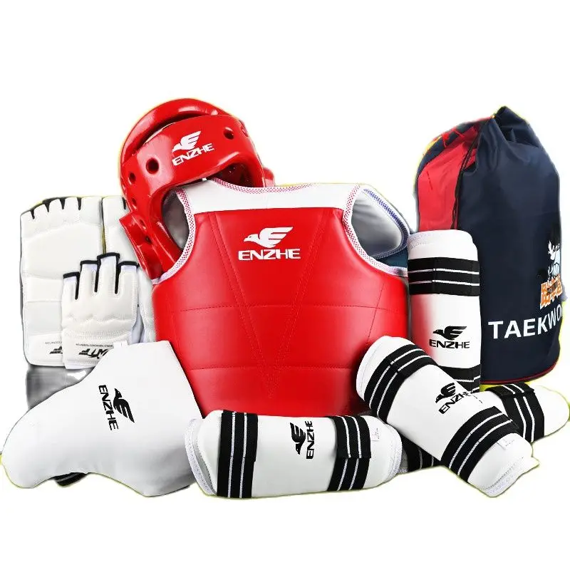 Paquete:1 protector de pecho; 1 par de protectores de brazo; espinilleras 1 par de; 1 casco; 1 protector de ingle; 1 par de guantes de Taekwondo; 1 par de calzado; 1 piezaBolsa(Total de 8 piezas)
