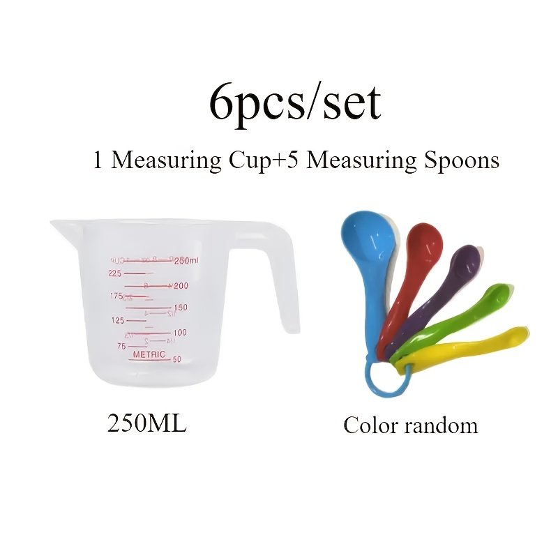 Un juego de vasos y cucharas medidoras de plástico, que incluye cinco